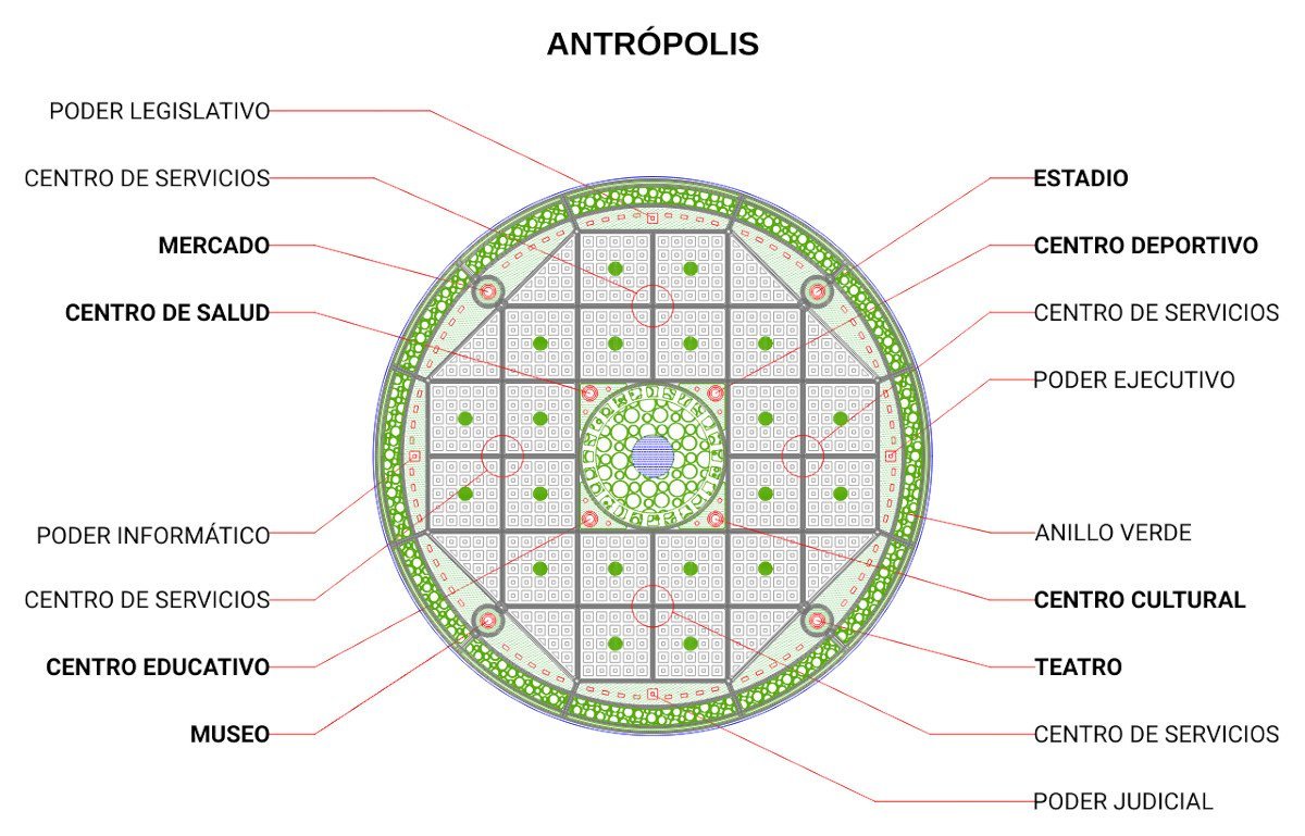 Chakana Antrópolis es una Ecópolis Circular de usos múltiples, principalmente residencial o de alojamiento, que puede albergar una alta densidad de población si fuera necesario, sin perder eficiencia.