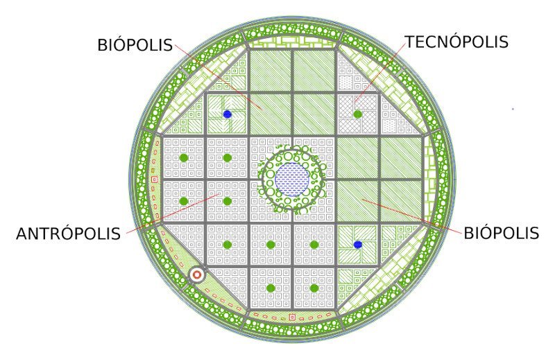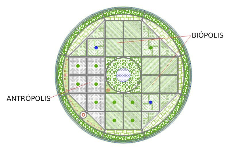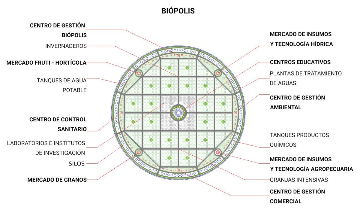 Chakana Biópolis es una ciudad diseñada para concentrar las funciones relativas al mantenimiento de la vida; el tratamiento de aguas, producción y distribución de alimentos, tratamiento de los residuos orgánicos, almacenaje de víveres, etc.