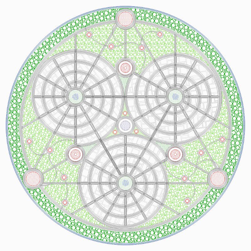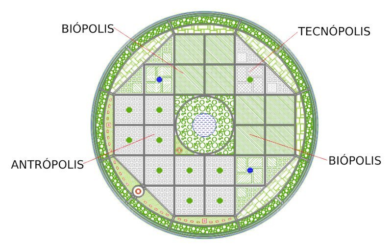 El modelo Triskel de Ecópolis Circular, fue la primera ciudad que diseñé, explorando formas alternativas a la cuadrícula para lograr una trama urbana.