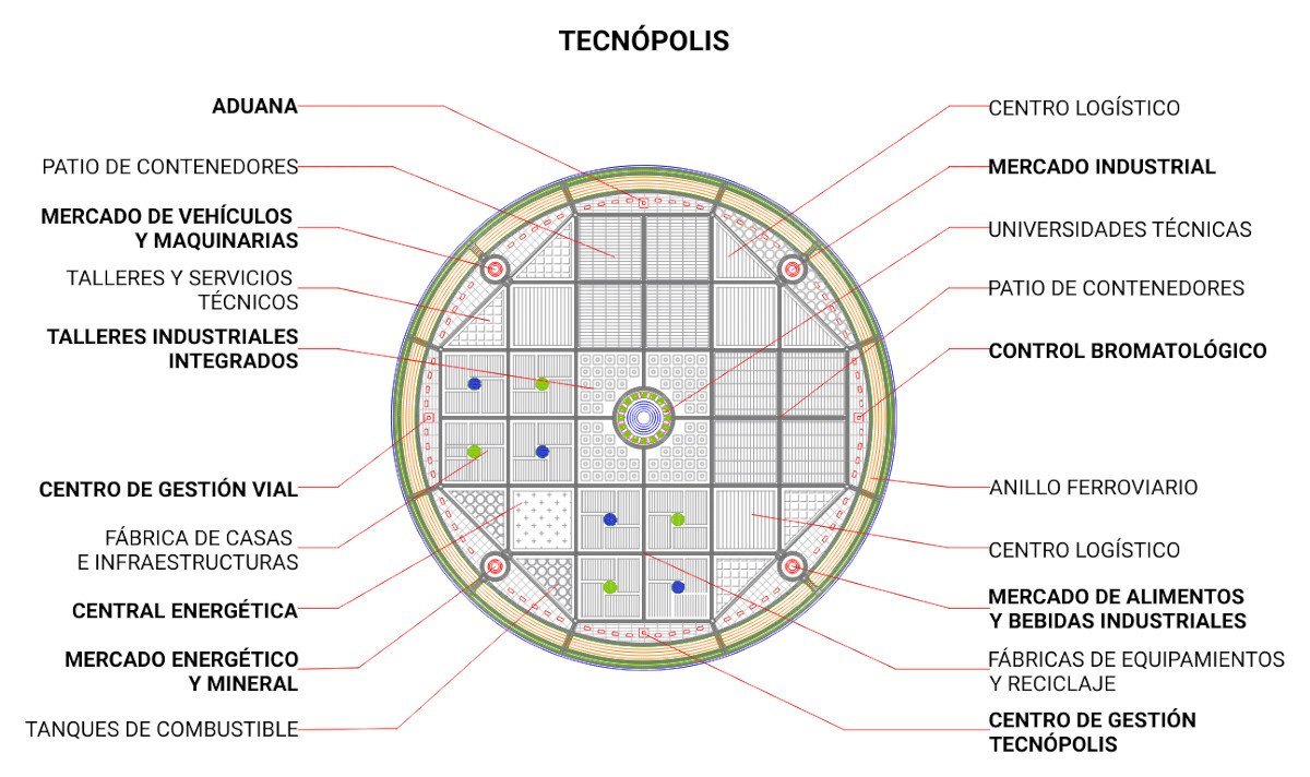 Las Tecnópolis funcionan como un complejo industrial, comercial y logístico, por lo que pueden complementar ciudades, puertos, minas, o nodos viales.