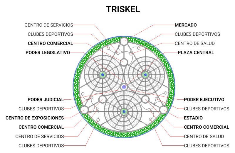 Triskel es un modelo de Ecópolis Circular compuesto por tres espirales unidos en sus extremos, formando la figura de un Triskel en el interior de un círculo.